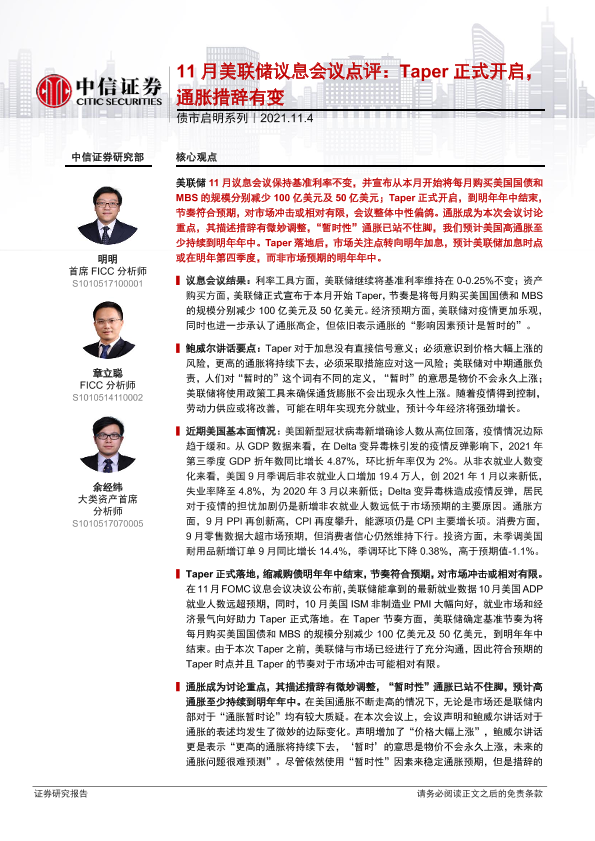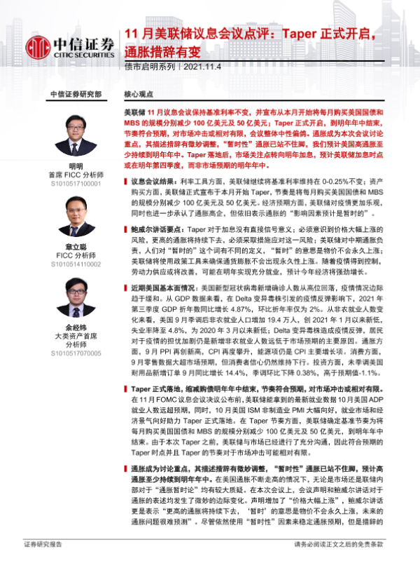 【中信证券】【20211104】债市启明系列-11月美联储议息会议点评:Taper正式开启,通胀措辞有变-31页