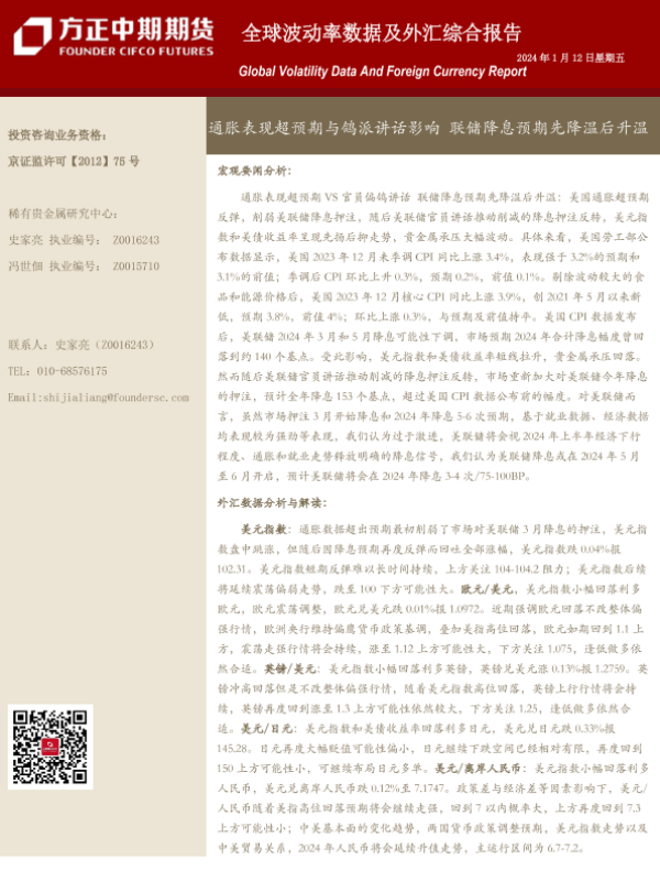【方正中期期货】【20240112】全球波动率数据及外汇综合报告:通胀表现超预期与鸽派讲话影响 联储降息预期先降温后升温-18页