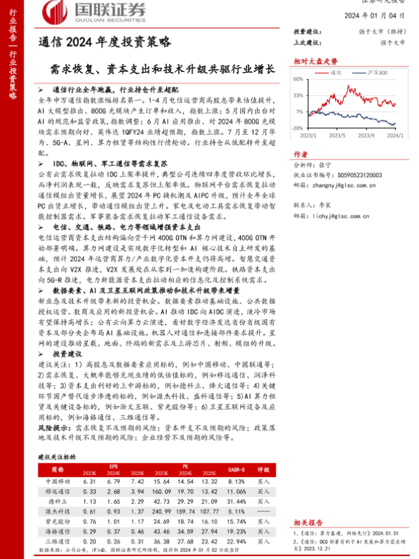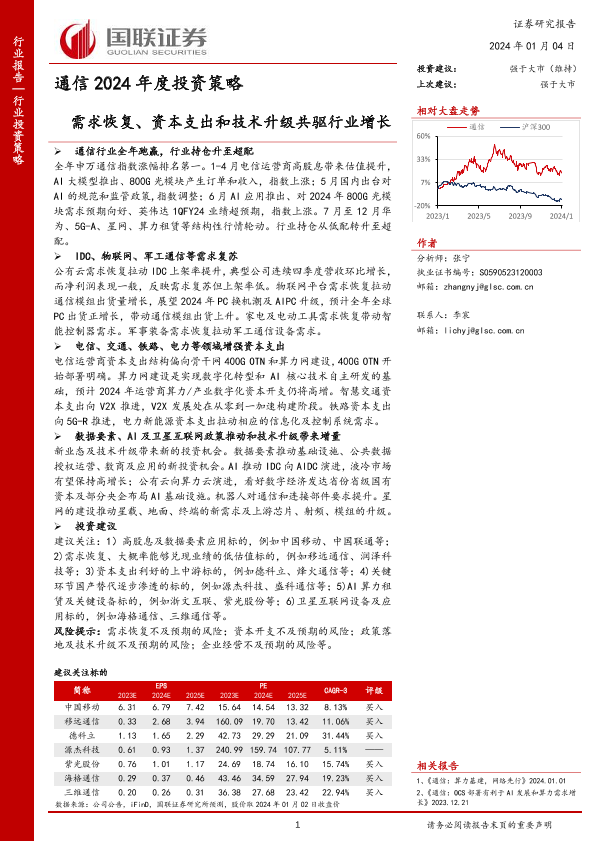 【国联证券】【20240104】通信行业2024年度投资策略:需求恢复、资本支出和技术升级共驱行业增长-40页