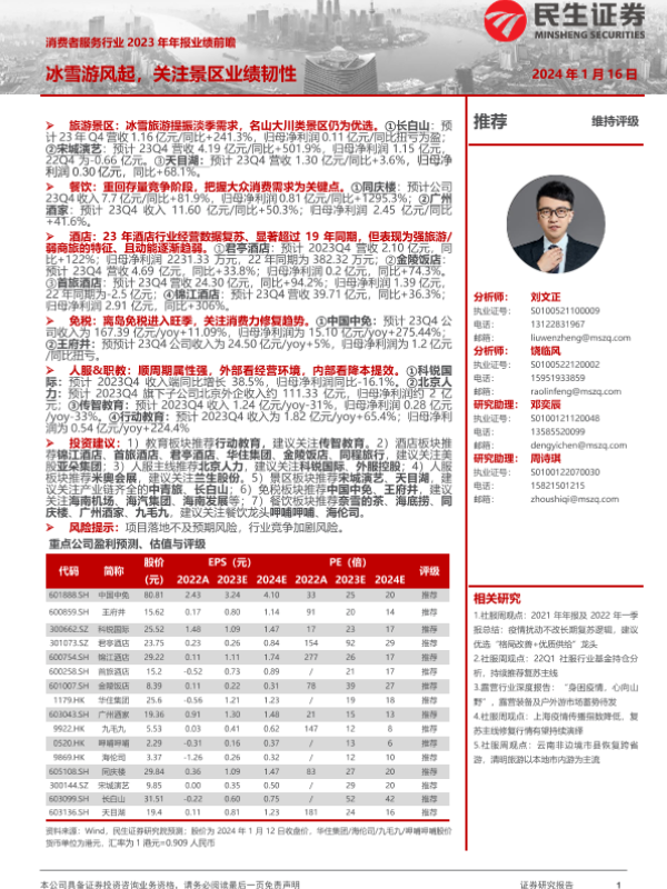 【民生证券】【20240116】消费者服务行业2023年年报业绩前瞻:冰雪游风起,关注景区业绩韧性-18页