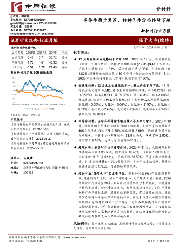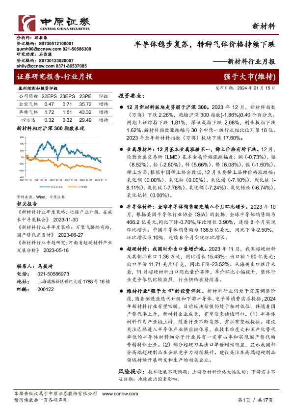 【中原证券】【20240115】新材料行业月报:半导体稳步复苏,特种气体价格持续下跌-17页