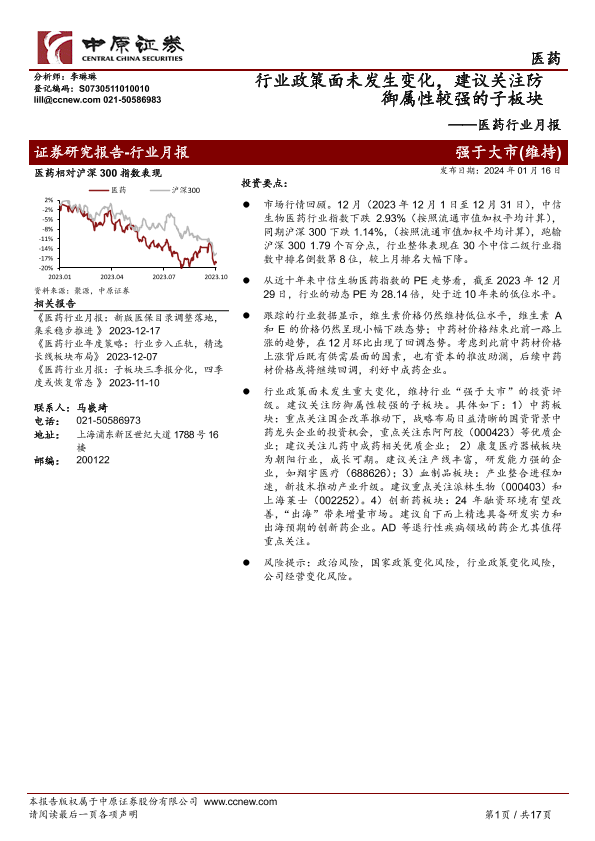 【中原证券】【20240116】医药行业月报:行业政策面未发生变化,建议关注防御属性较强的子板块-17页