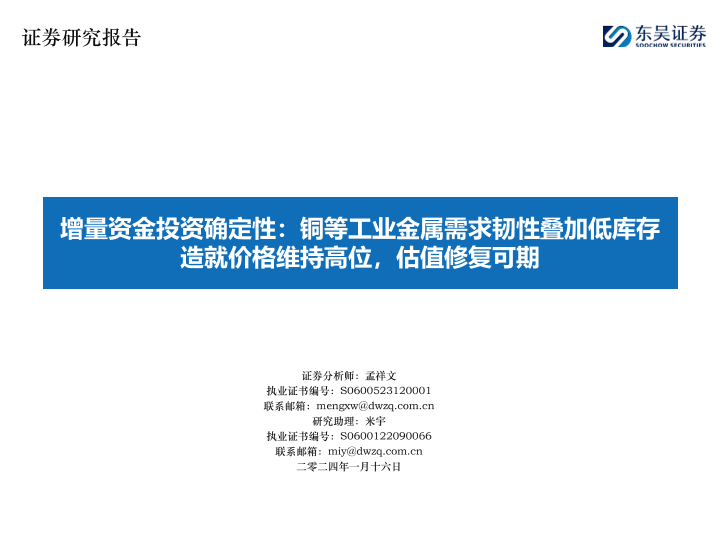【东吴证券】【20240116】增量资金投资确定性:铜等工业金属需求韧性叠加低库存造就价格维持高位,估值修复可期-37页