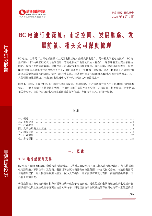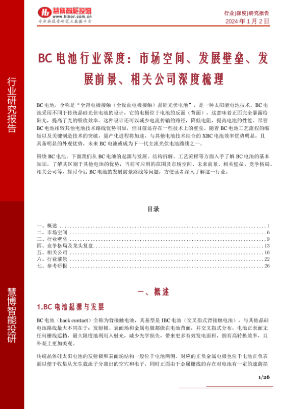 【慧博智能投研】【20240102】BC电池行业深度:市场空间、发展壁垒、发展前景、相关公司深度梳理-25页