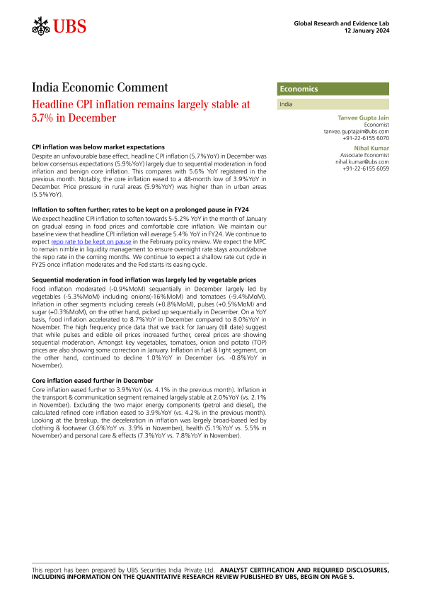 【UBS Securities India Private Ltd】【20240112】India Economic Comment Headline CPI inflation remains largely stable at 5.7% in December-8页
