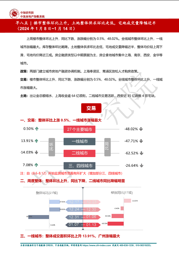 【中指研究院 中国房地产指数系统】【20240114】早八点丨楼市整体环比上升,土地整体供求环比走低,宅地成交量降幅近半-14页