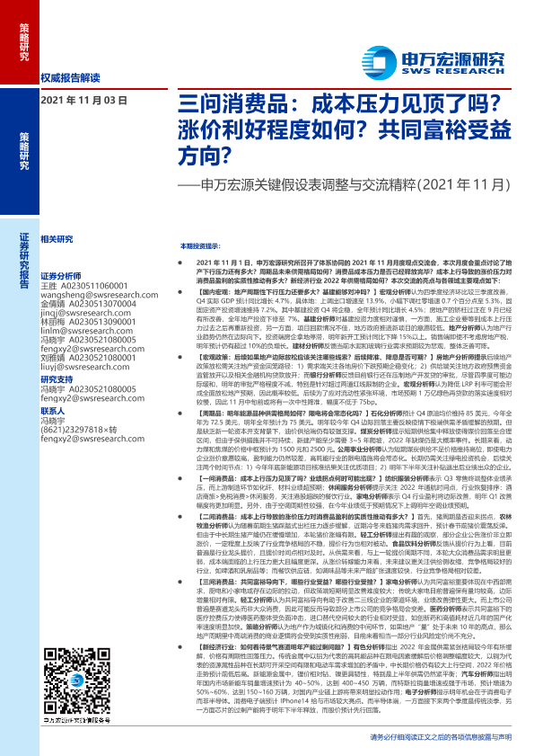 【申万宏源】【20211103】关键假设表调整与交流精粹(2021年11月):三问消费品,成本压力见顶了吗?涨价利好程度如何?共同富裕受益方向?-22页