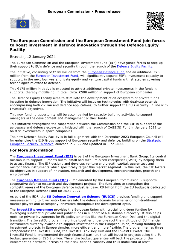 【European Commission】【20240112】The European Commission and the European Investment Fund join forces to boost investment in defence innovation through the Defence Equity Facility-1页