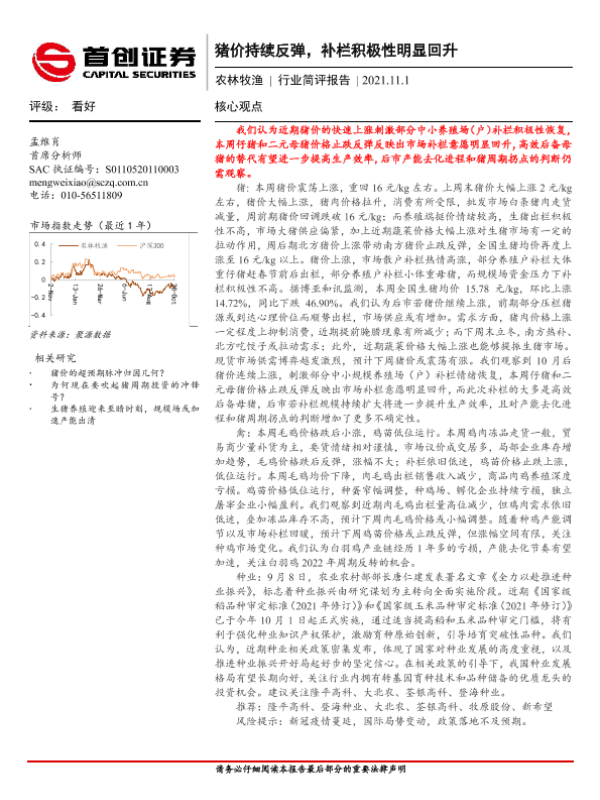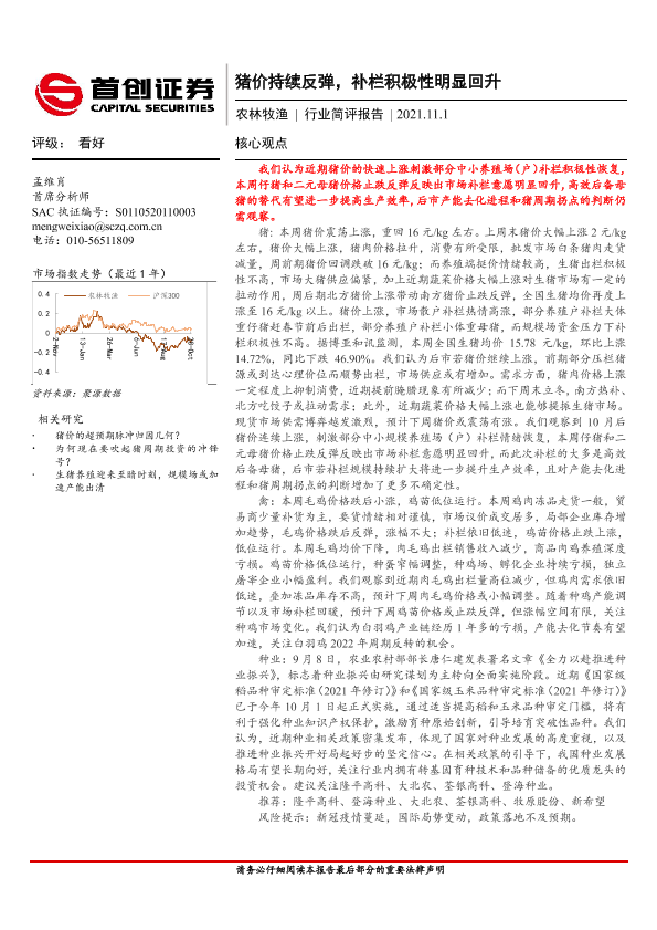 【首创证券】【20211101】农林牧渔行业简评报告:猪价持续反弹,补栏积极性明显回升-18页