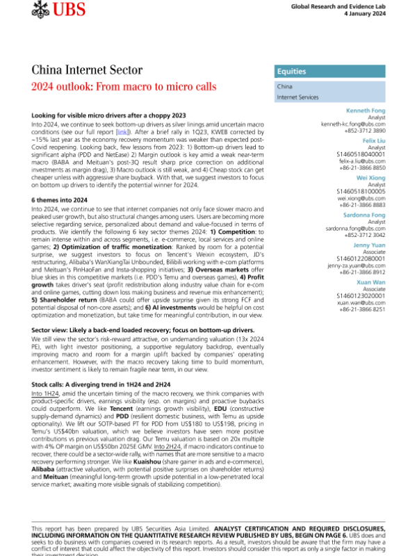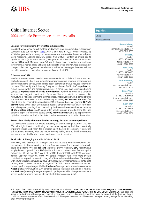 【UBS Securities Asia Limited】【20240104】China Internet Sector 2024 outlook From macro to micro calls-16页