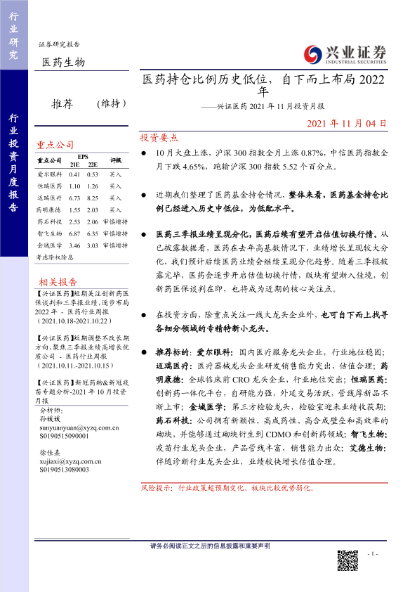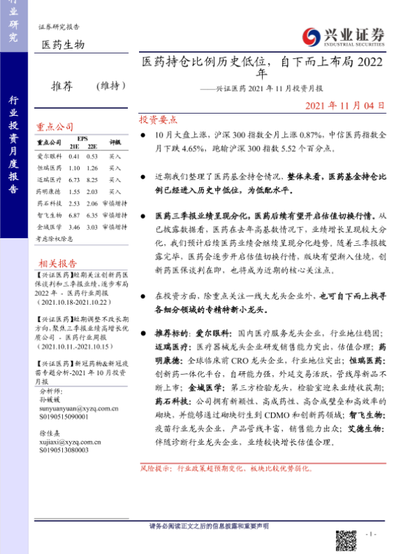 【兴业证券】【20211104】医药行业2021年11月投资月报:医药持仓比例历史低位,自下而上布局2022年-20页