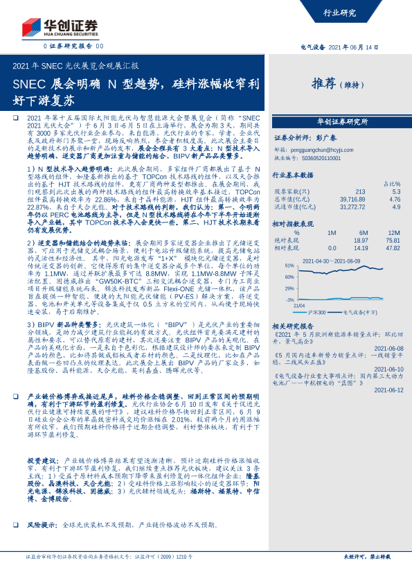 【华创证券】【20210614】电气设备行业2021年SNEC光伏展览会观展汇报:SNEC展会明确N型趋势,硅料涨幅收窄利好下游复苏-16页
