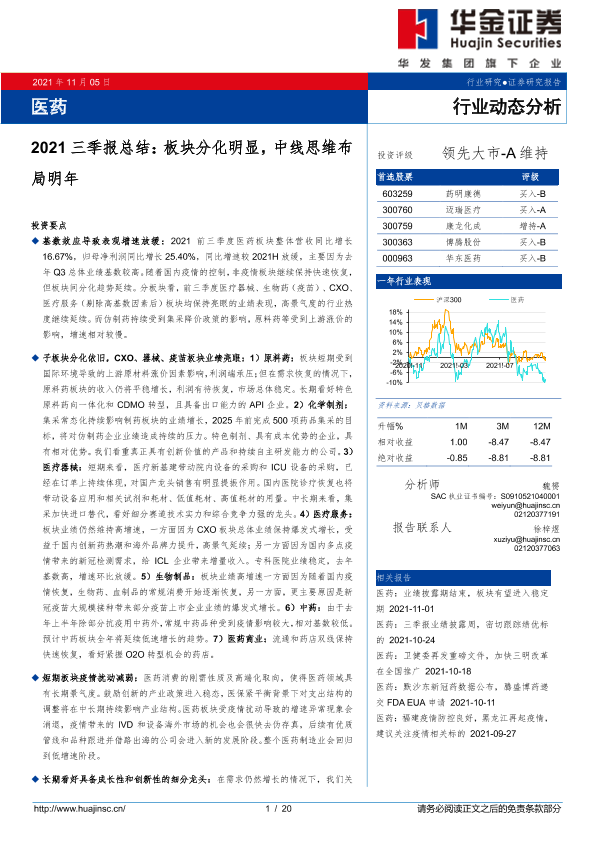 【华金证券】【20211105】医药行业动态分析:2021三季报总结,板块分化明显,中线思维布局明年-20页