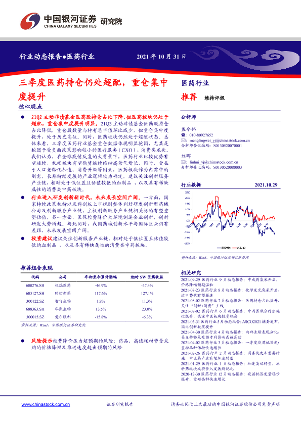 【银河证券】【20211031】医药行业动态报告:三季度医药持仓仍处超配,重仓集中度提升-40页