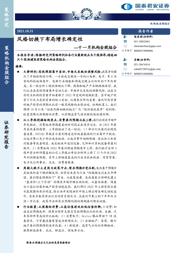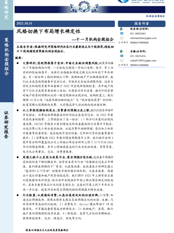 【国泰君安证券】【20211031】十一月机构金股组合:风格切换下布局增长确定性-27页