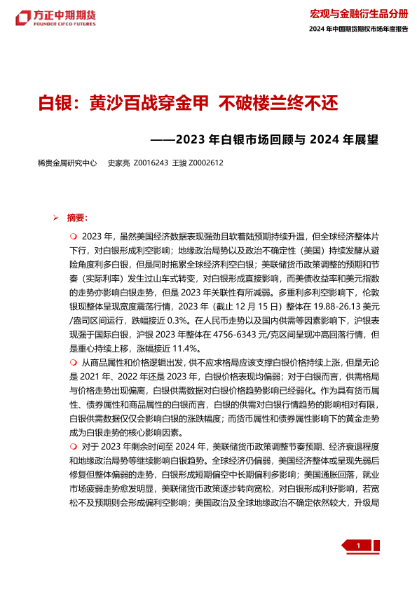 【方正中期期货】【20240109】2023年白银市场回顾与2024年展望:白银:黄沙百战穿金甲 不破楼兰终不还-56页