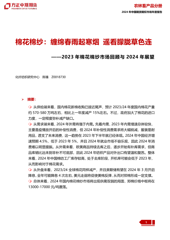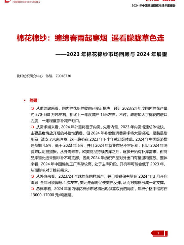 【方正中期期货】【20240109】2023年棉花棉纱市场回顾与2024年展望:棉花棉纱:缠绵春雨起寒烟 遥看朦胧草色连-34页