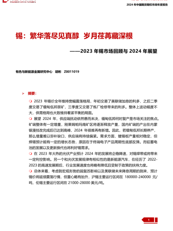 【方正中期期货】【20240109】2023年锡市场回顾与2024年展望:锡:繁华落尽见真醇 岁月荏苒藏深根-27页