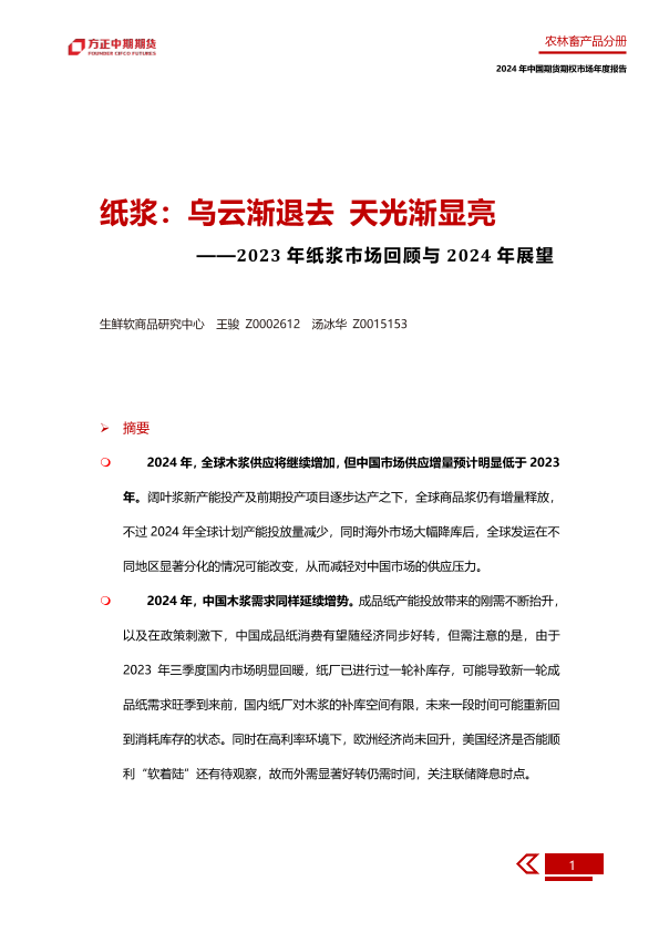 【方正中期期货】【20240109】2023年纸浆市场回顾与2024年展望:纸浆:乌云渐退去 天光渐显亮-28页