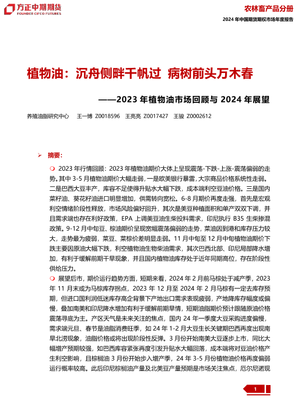 【方正中期期货】【20240109】2023年植物油市场回顾与2024年展望:植物油:沉舟侧畔干帆过 病树前头万木春-41页