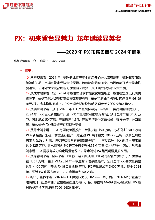 【方正中期期货】【20240109】2023年PX市场回顾与2024年展望:PX:初来登台显魅力 龙年继续显英姿-26页