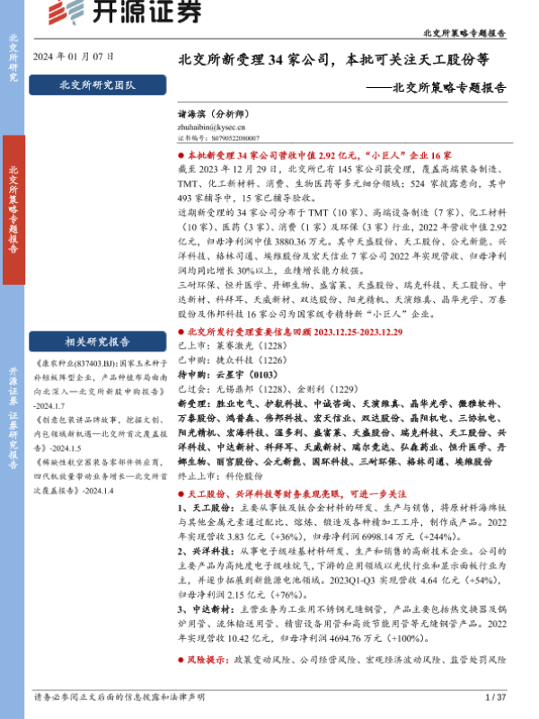 【开源证券】【20240107】北交所策略专题报告:北交所新受理34家公司,本批可关注天工股份等-37页
