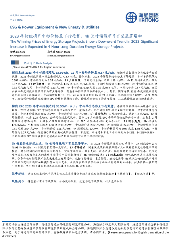 【海通国际】【20240107】2023年储能项目中标价格呈下行趋势,4h长时储能项目有望显著增加-10页