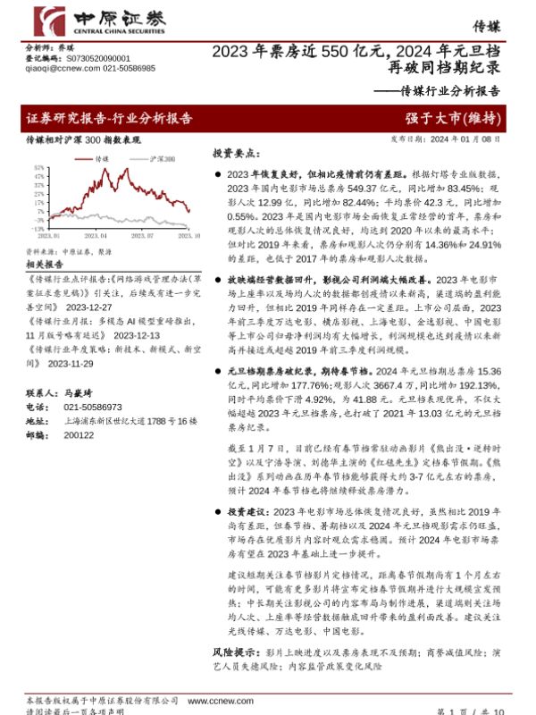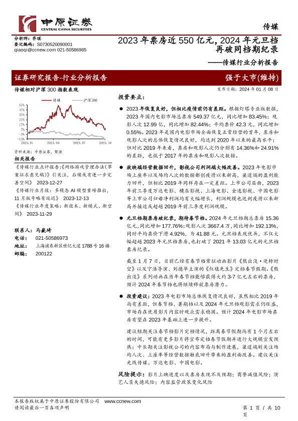 【中原证券】【20240108】传媒行业分析报告:2023年票房近550亿元,2024年元旦档再破同档期纪录-10页