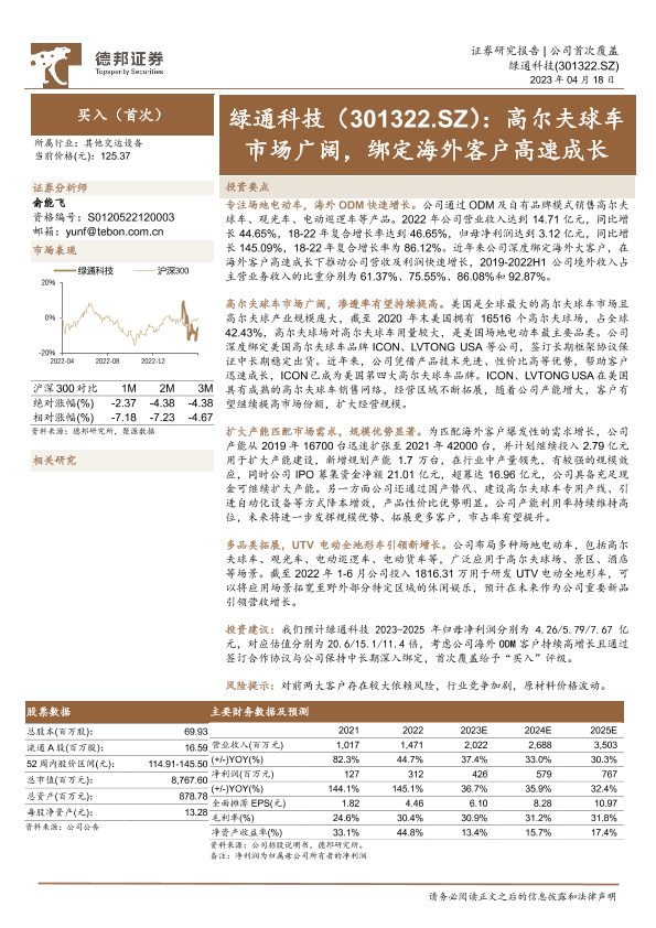 【德邦证券】【20230418】绿通科技(301322)高尔夫球车市场广阔,绑定海外客户高速成长-19页