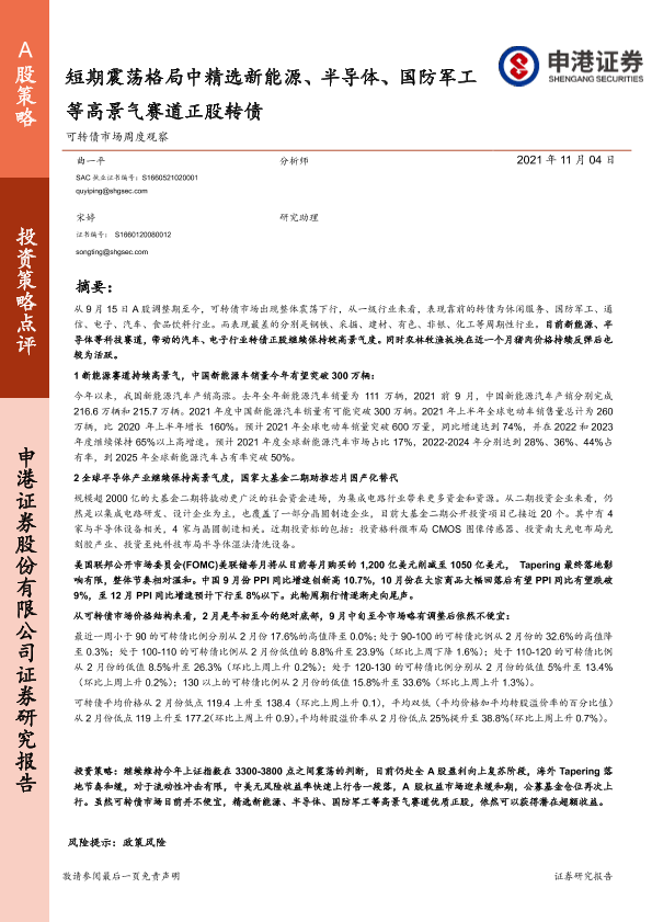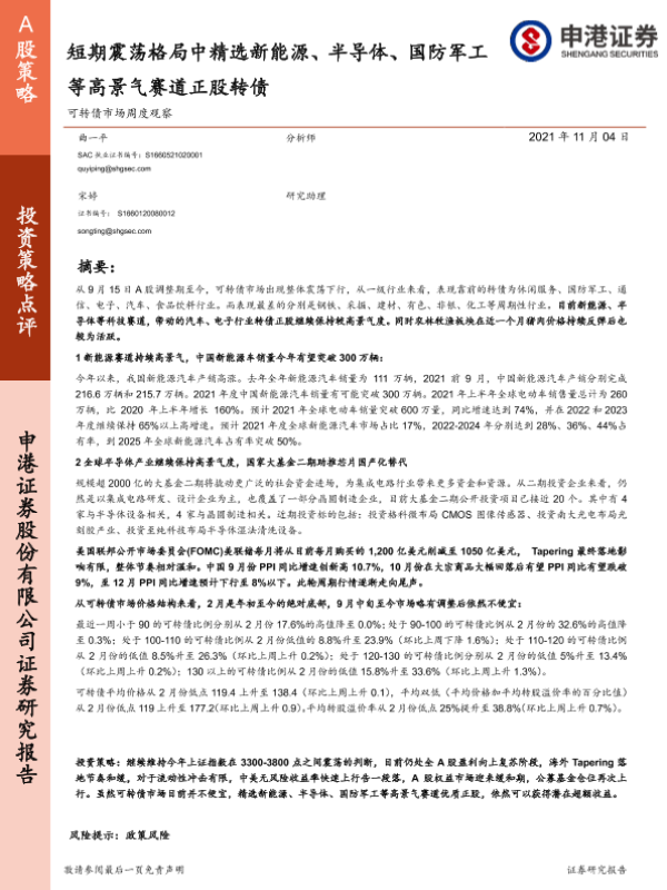 【申港证券】【20211104】可转债市场周度观察:短期震荡格局中精选新能源、半导体、国防军工等高景气赛道正股转债-32页