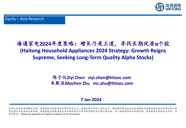 【海通国际】【20240107】海通家电2024年度策略:增长乃是王道,寻找长期优质α个股-48页