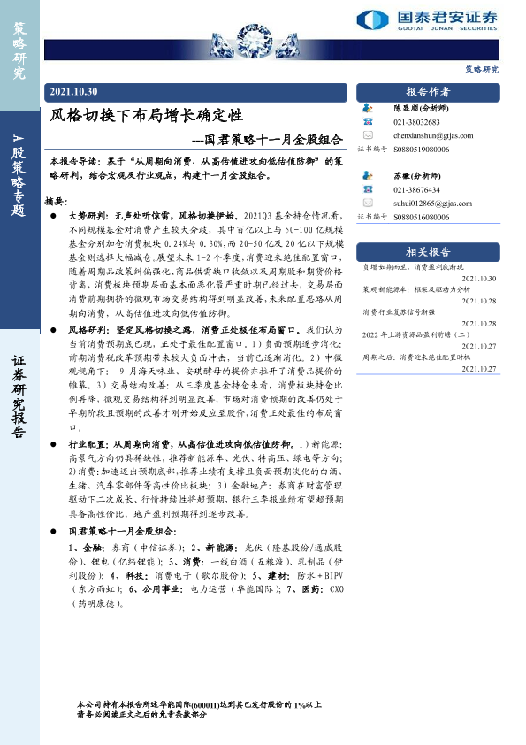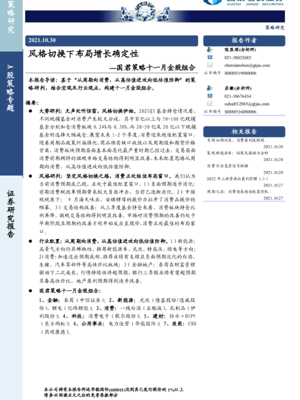 【国泰君安证券】【20211030】国君策略十一月金股组合:风格切换下布局增长确定性-18页