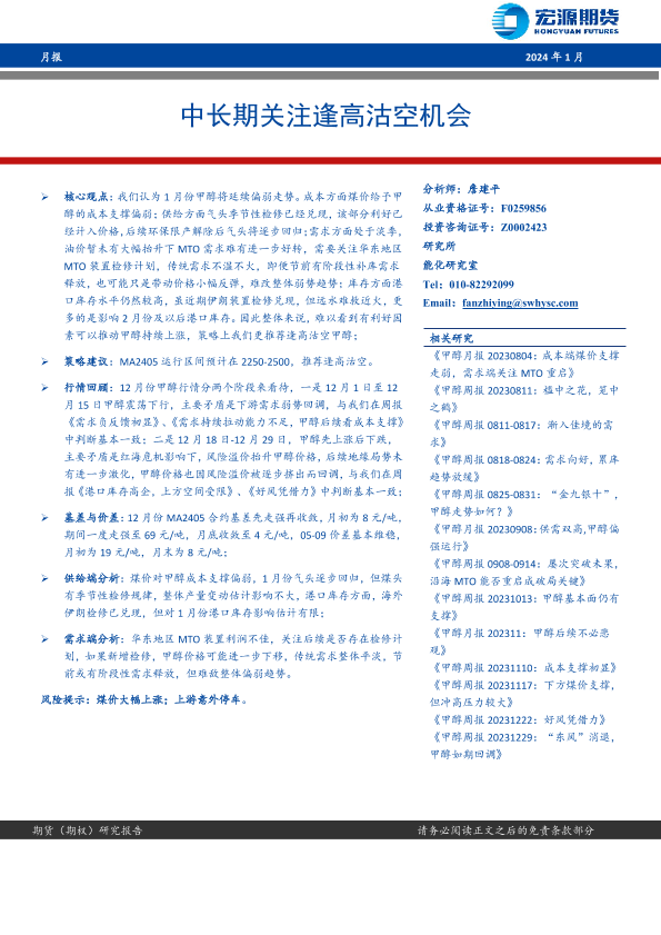 【宏源期货】【20240105】甲醇月报:中长期关注逢高沽空机会-11页