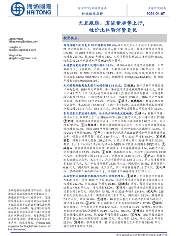 【海通国际】【20240107】旅游服务业行业信息点评:元旦跟踪:客流量趋势上行,性价比体验消费更优-13页