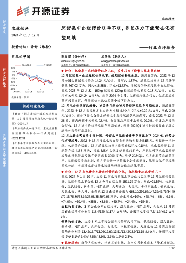 【开源证券】【20240112】农林牧渔行业点评报告:肥猪集中出栏猪价旺季不旺,多重压力下能繁去化有望延续-12页