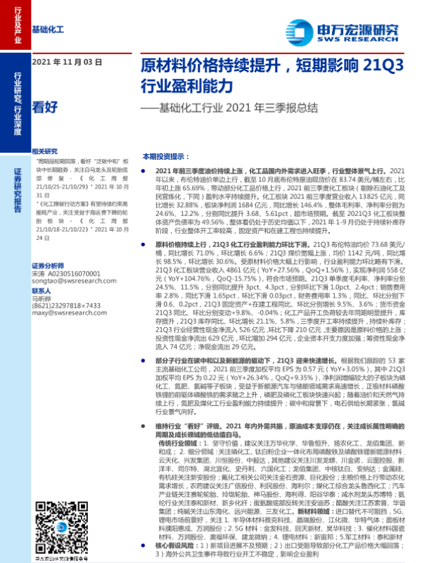 【申万宏源】【20211103】基础化工行业2021年三季报总结:原材料价格持续提升,短期影响21Q3行业盈利能力-25页