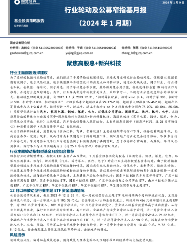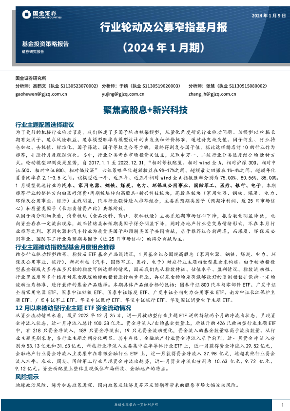 【国金证券】【20240109】行业轮动及公募窄指基月报(2024年1月期):聚焦高股息+新兴科技-12页