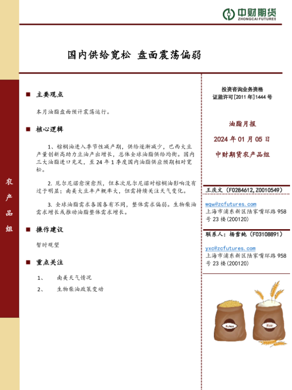 【中财期货】【20240105】油脂月报:国内供给宽松 盘面震荡偏弱-10页