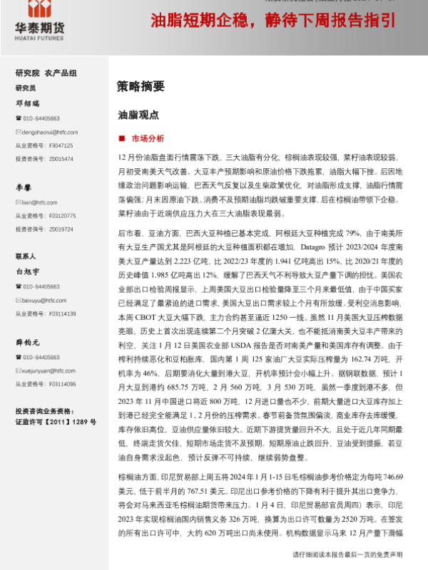 【华泰期货】【20240107】油脂月报:油脂短期企稳,静待下周报告指引-12页