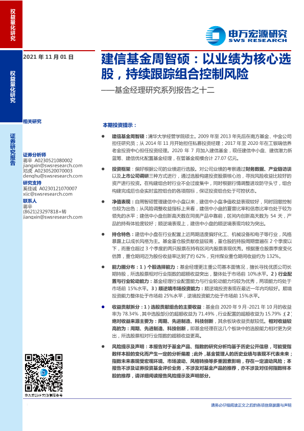 【申万宏源】【20211101】基金经理研究系列报告之十二:建信基金周智硕,以业绩为核心选股,持续跟踪组合控制风险-18页