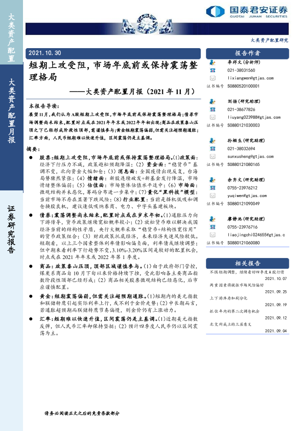 【国泰君安证券】【20211030】大类资产配置月报(2021年11月):短期上攻受阻,市场年底前或保持震荡整理格局-22页