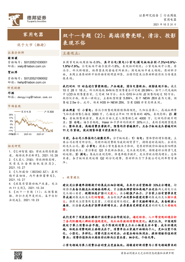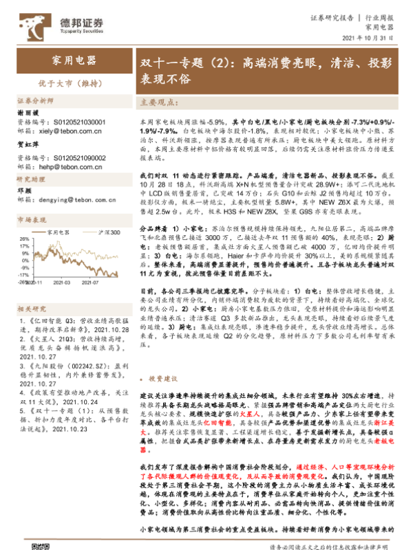 【德邦证券】【20211031】家用电器行业双十一专题(2):高端消费亮眼,清洁、投影表现不俗-21页