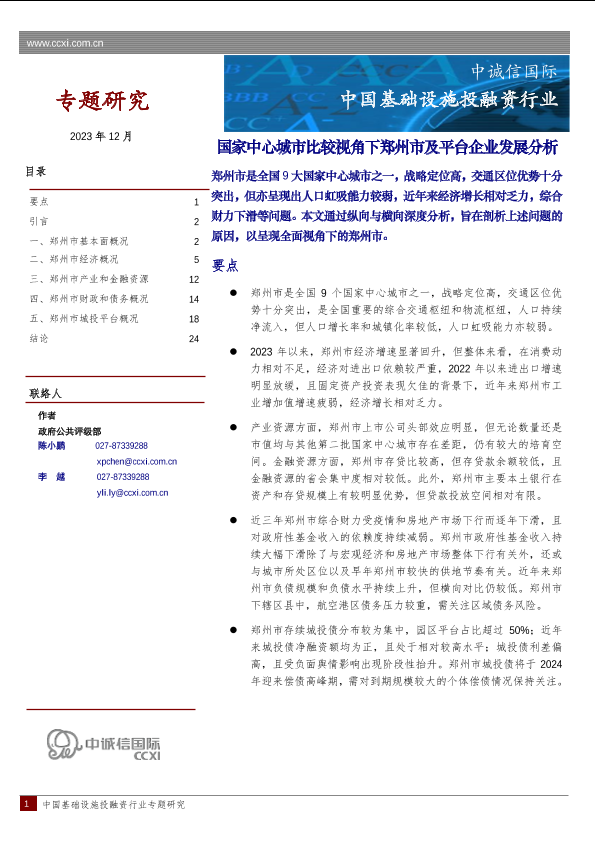 【中诚信国际】【202312】国家中心城市比较视角下郑州市及平台企业发展分析-25页