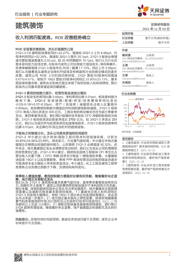 【天风证券】【20211103】建筑装饰行业专题研究:收入利润匹配度高,ROE改善趋势确立-21页