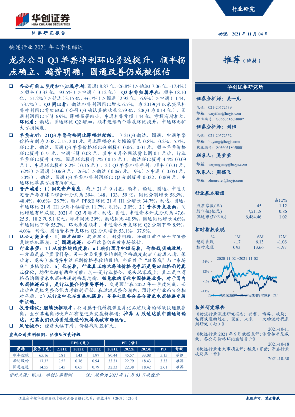 【华创证券】【20211104】快递行业2021年三季报综述:龙头公司Q3单票净利环比普遍提升,顺丰拐点确立、趋势明确,圆通改善仍或被低估-18页