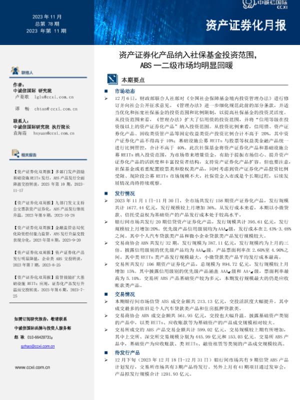 【中诚信国际】【202311】资产证券化产品纳入社保基金投资范围,ABS一二级市场均明显回暖-22页