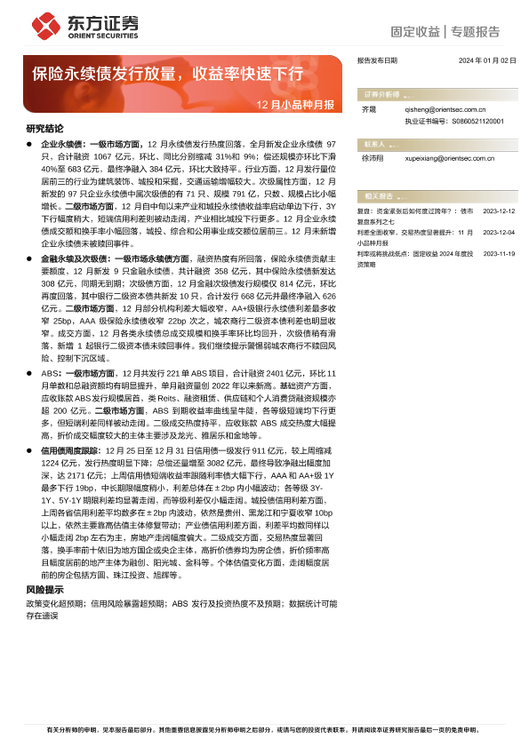 【东方证券】【20240102】12月小品种月报:保险永续债发行放量,收益率快速下行-23页