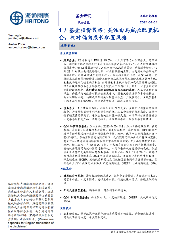 【海通国际】【20240104】1月基金投资策略:关注白马成长配置机会,相对偏向成长配置风格-20页