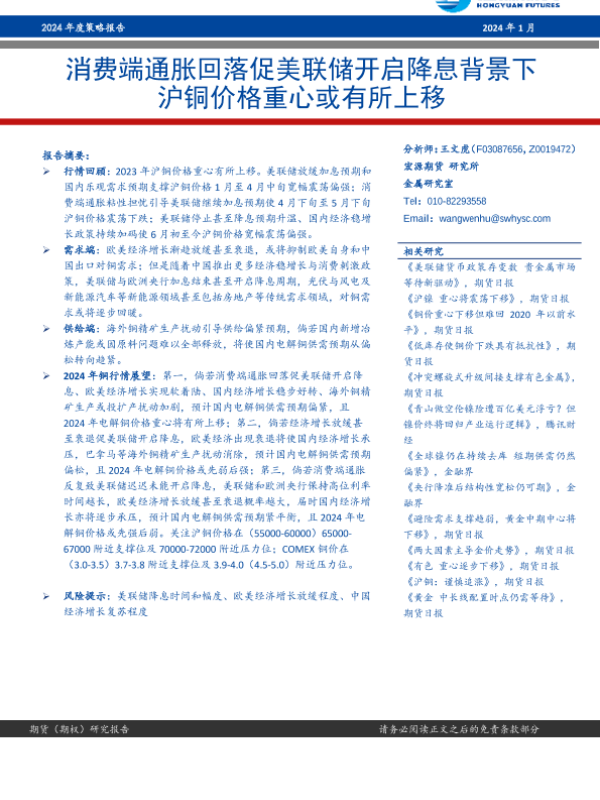 【宏源期货】【20240103】2024年度策略报告:消费端通胀回落促美联储开启降息背景下 沪铜价格重心或有所上移-21页