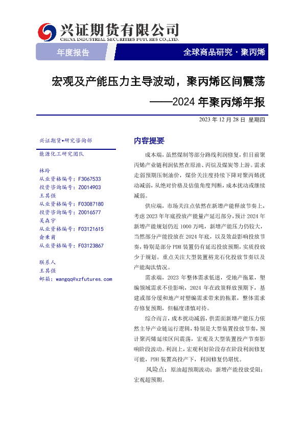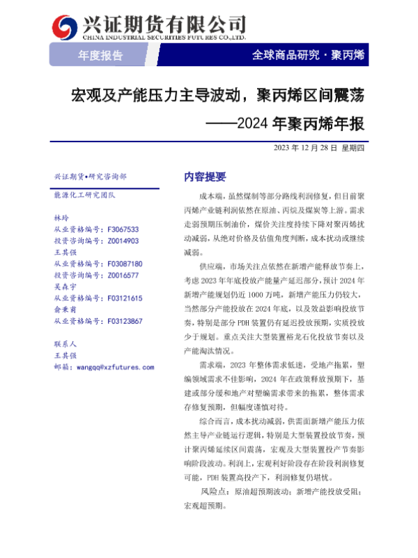 【兴证期货】【20231228】2024年聚丙烯年报:宏观及产能压力主导波动,聚丙烯区间震荡-10页